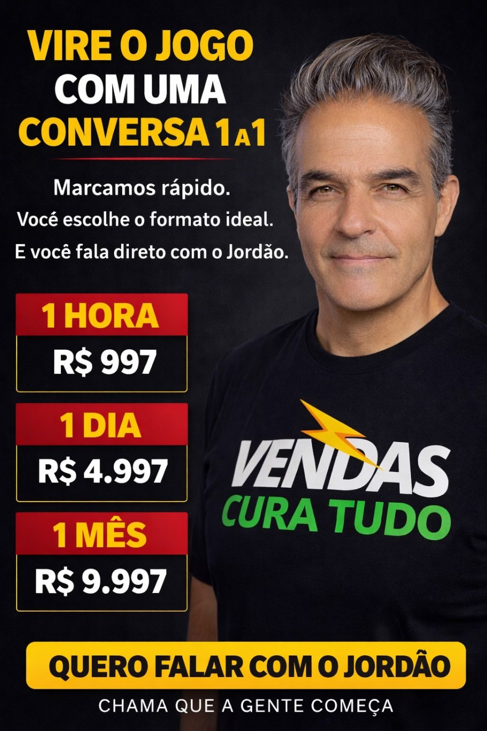 Mentoria Rainmaker: para quem já fez curso demais e ainda não virou o jogo. Acompanhamento real, método vivo e prática diária com o Jordão para transformar conhecimento em resultado. Não é mais um curso. É você vendendo de verdade com direção, ritmo e consistência.